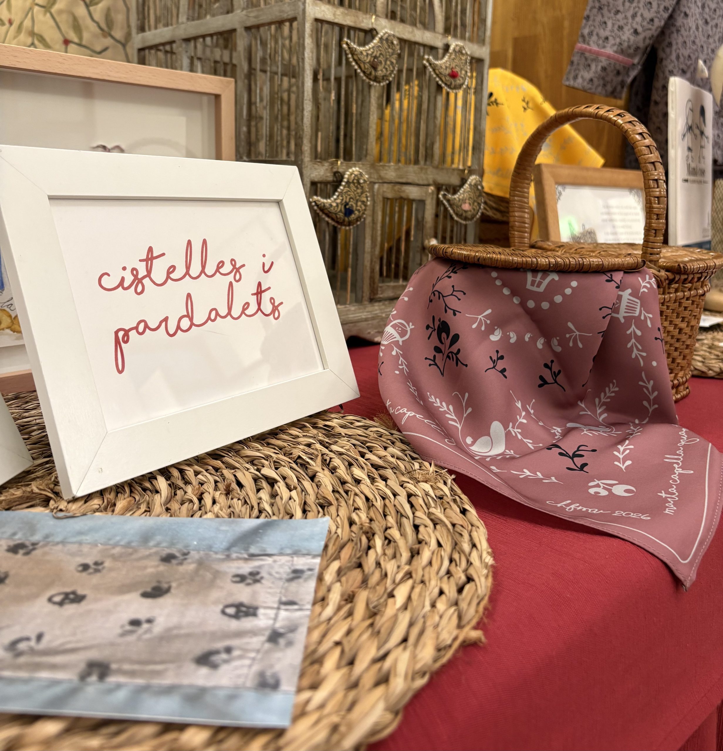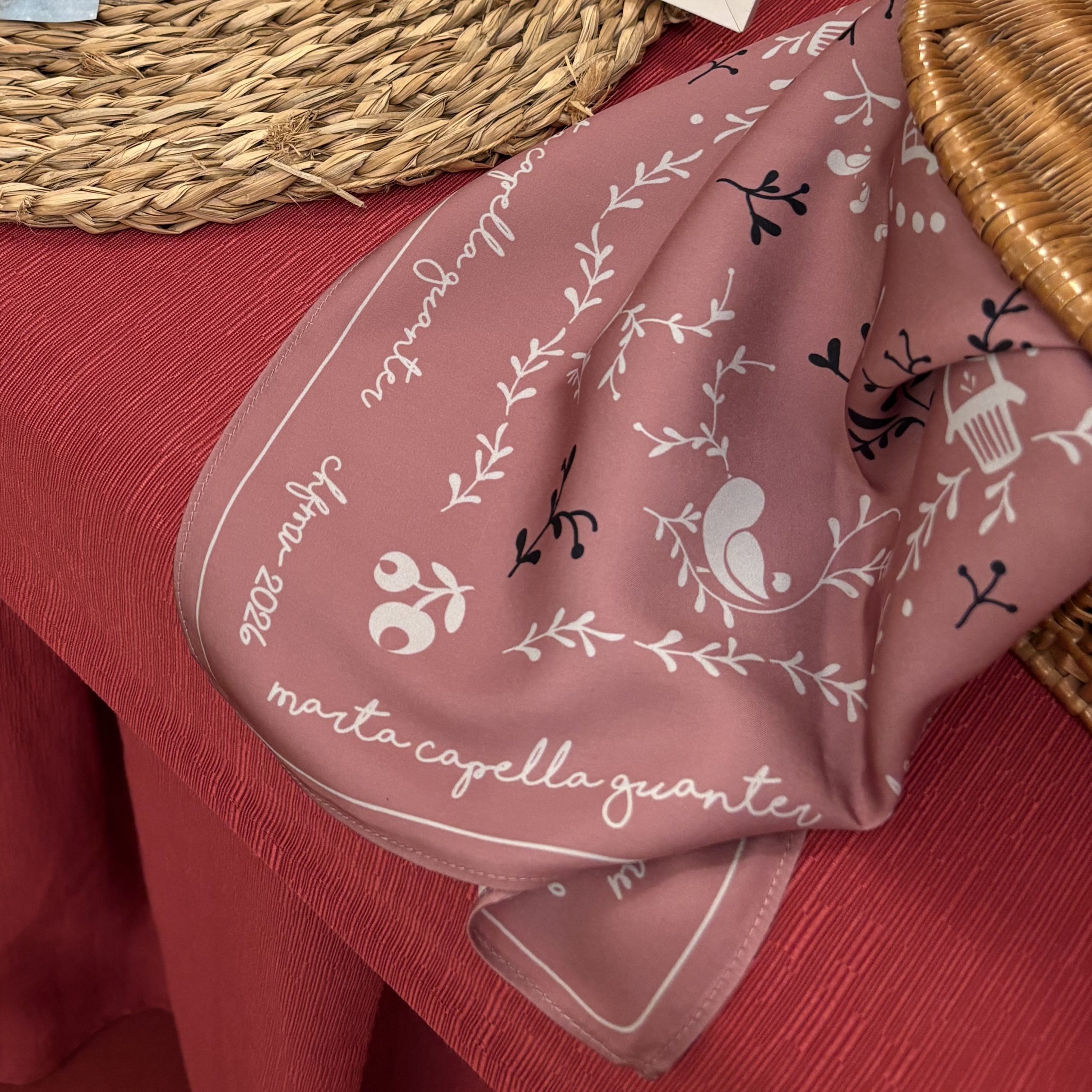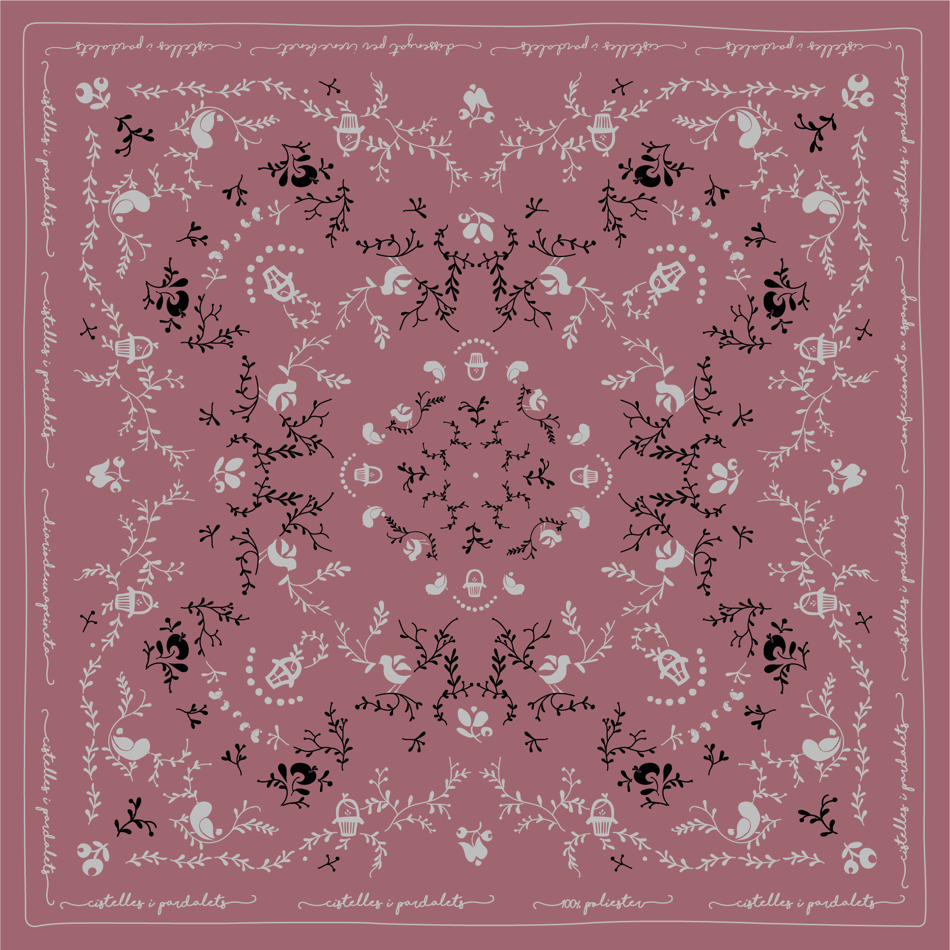 Pañuelo de formato 69x69cm, ideal para llevar con blusón o bien en cabeza para niño o caballero (con lazo pequeño). Estampado con motivo valenciano “cistelles i pardalets” diseñado por Irene Benet ©, sobre fondo liso.