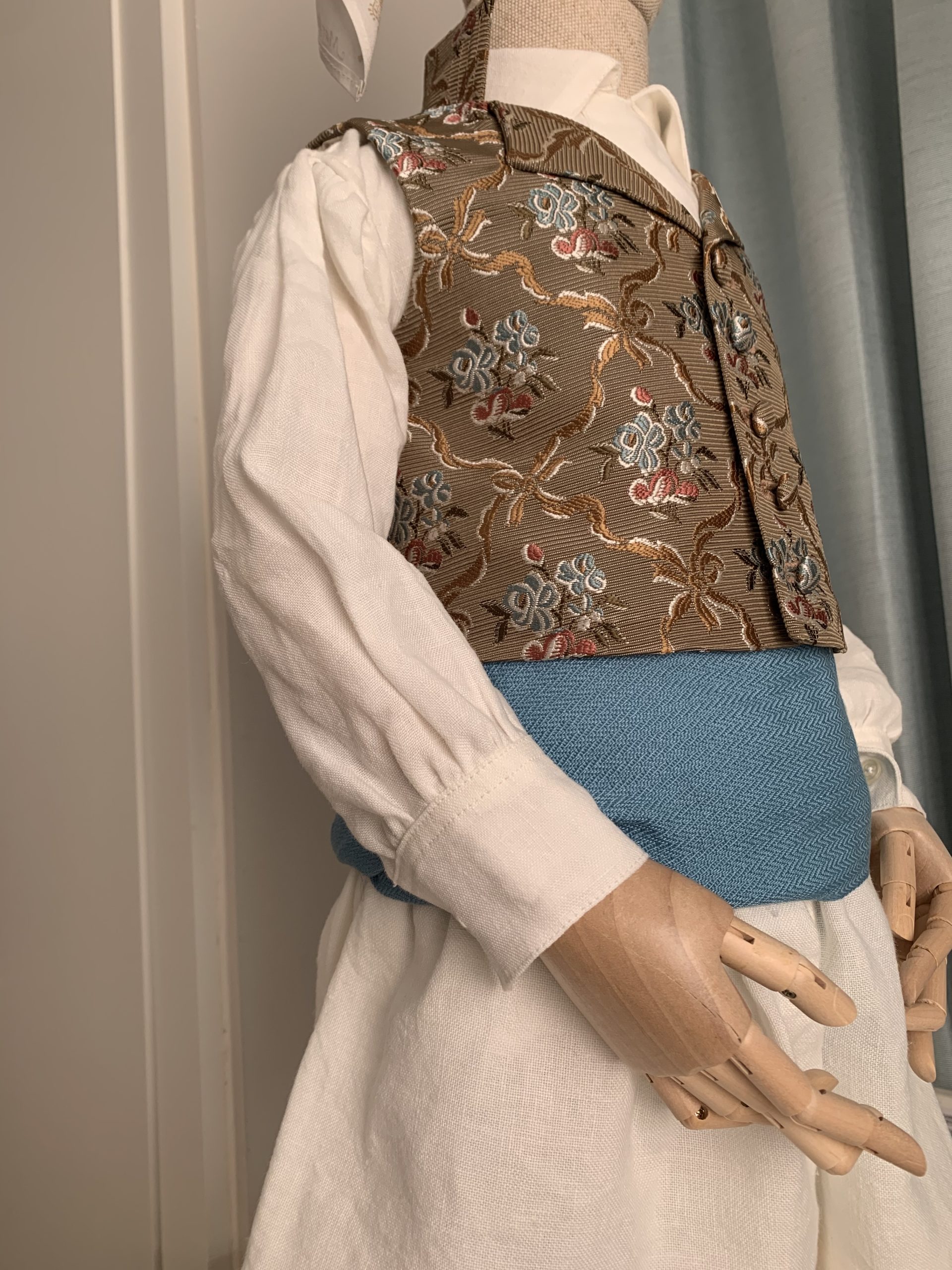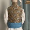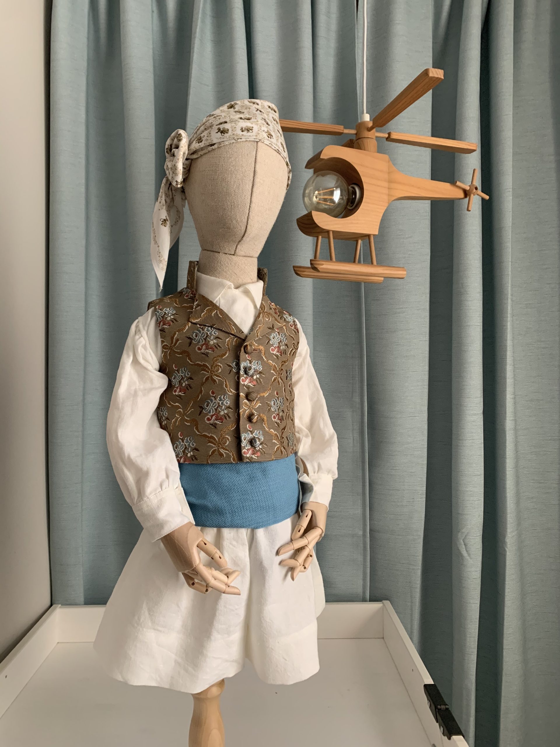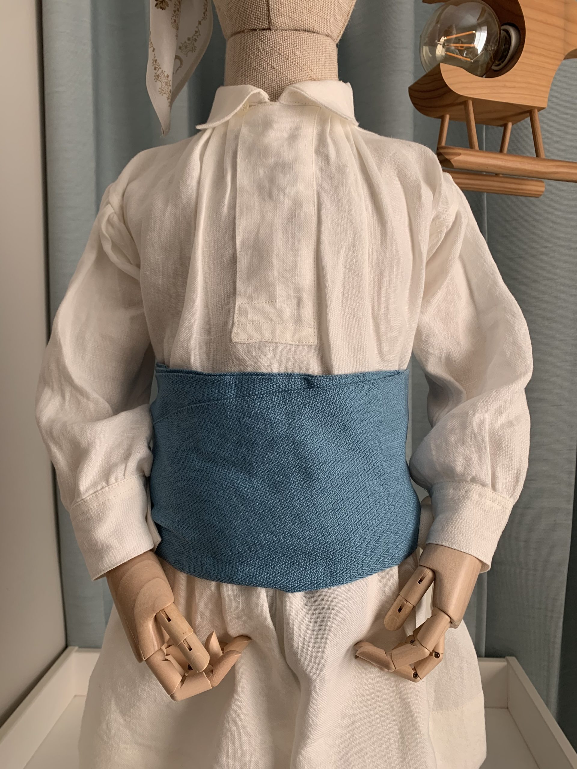 Conjunto de indumentaria tradicional valenciana masculina infantil compuesto por chaleco, realizado en tejido de rayón brocado con fondo en ottoman color verde y ramilletes de colores variados, camisa, zaragüell, faja color celeste y pañuelo color blanco con diseño floral pequeño. Diseñado acorde al tallaje estándar infantil. Forro del chaleco realizado en retorta de algodón 100%, perfecta para el contacto con la piel del bebé.