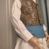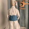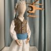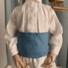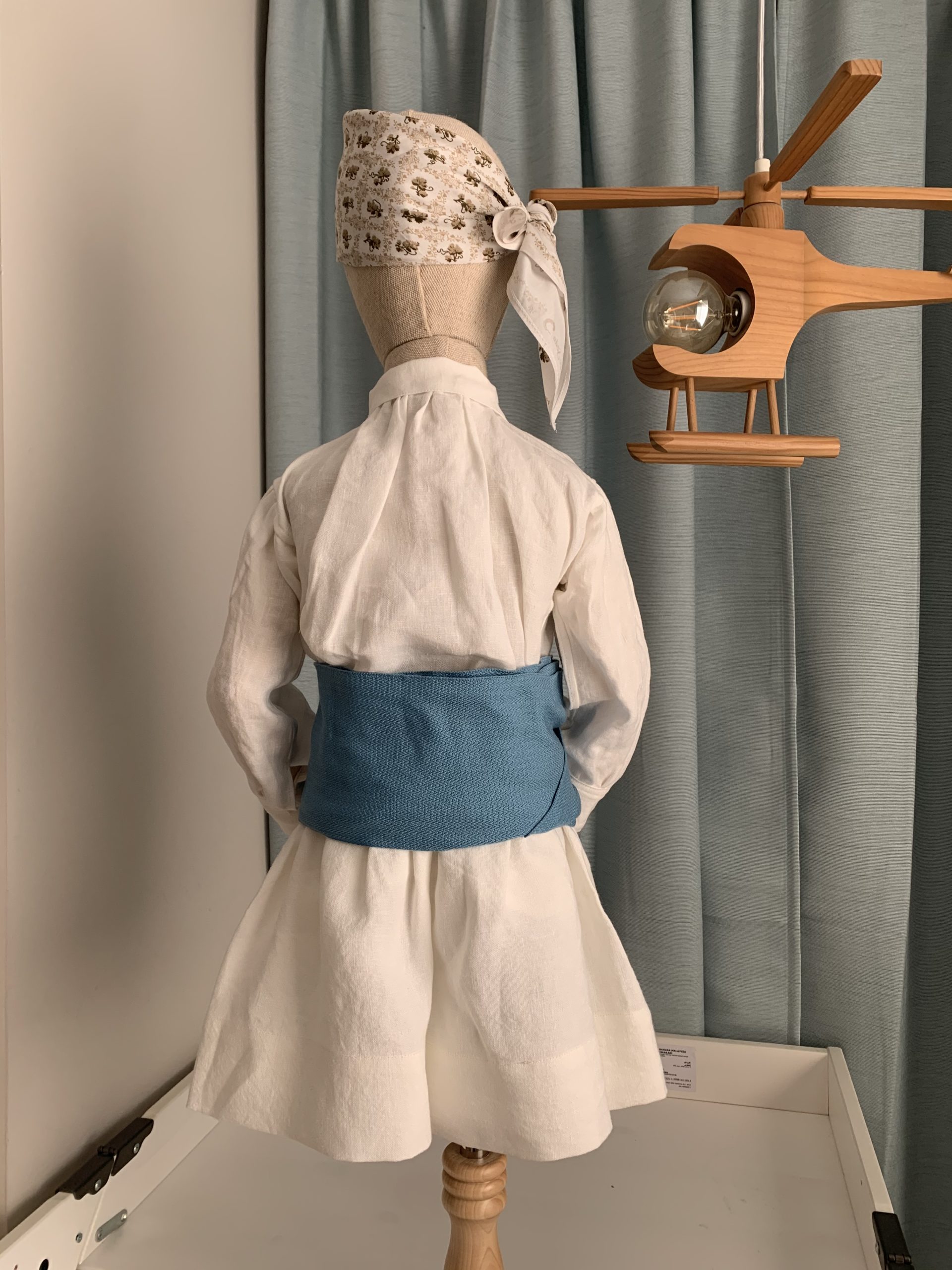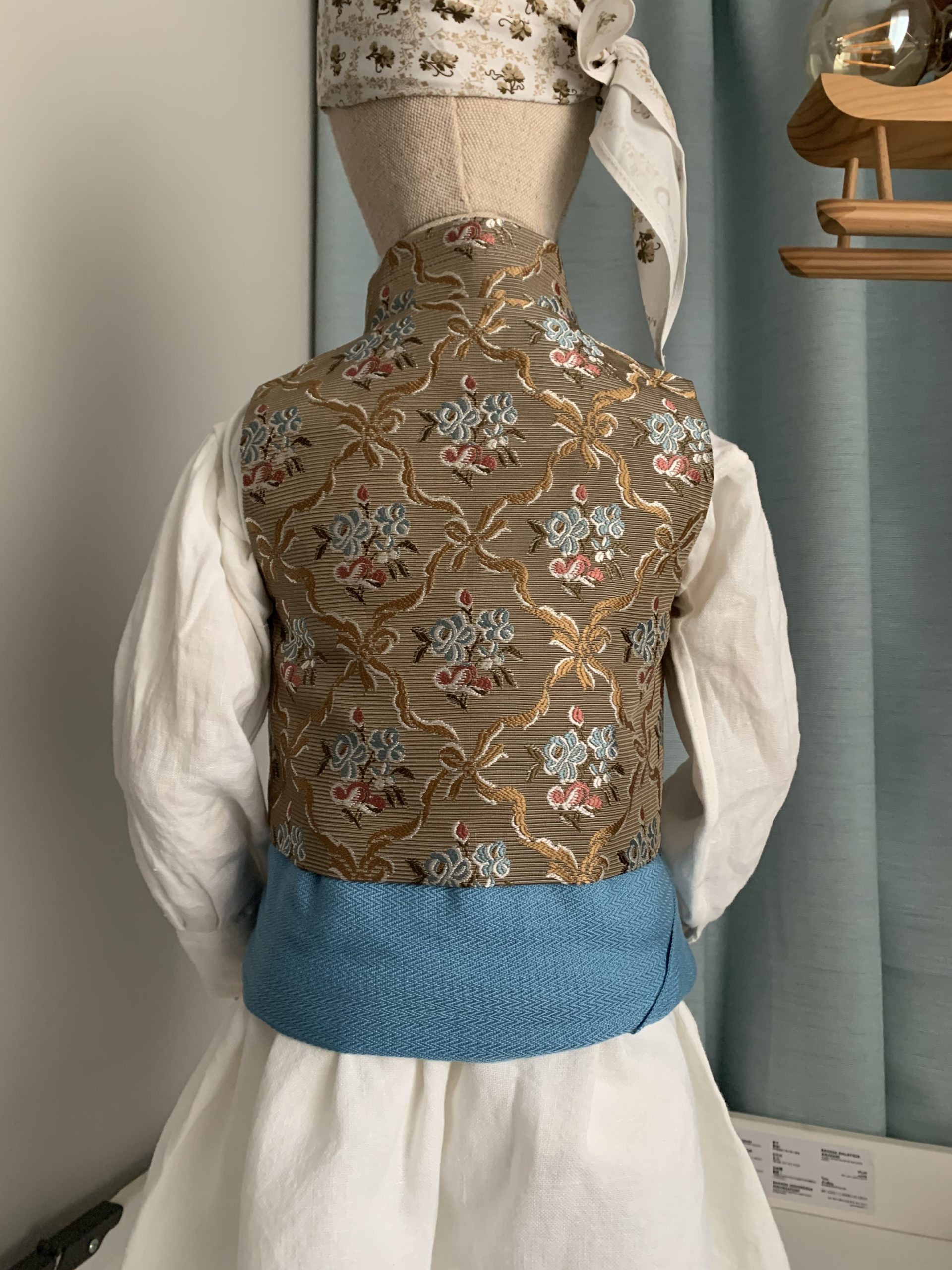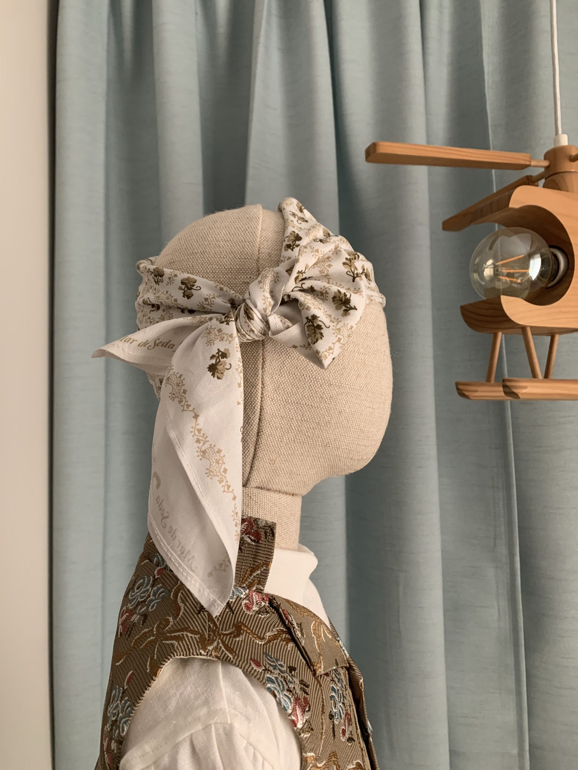 Conjunto de indumentaria tradicional valenciana masculina infantil compuesto por chaleco, realizado en tejido de rayón brocado con fondo en ottoman color verde y ramilletes de colores variados, camisa, zaragüell, faja color celeste y pañuelo color blanco con diseño floral pequeño. Diseñado acorde al tallaje estándar infantil. Forro del chaleco realizado en retorta de algodón 100%, perfecta para el contacto con la piel del bebé.